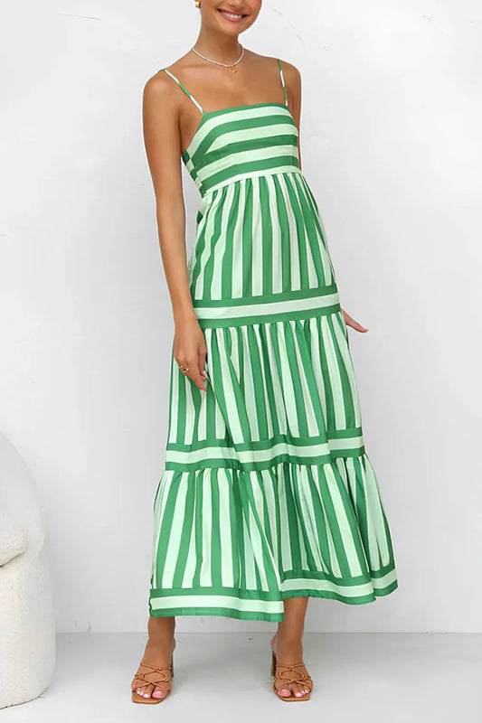 Striped Tie Belt Round Neck Puff Sleeve Dress