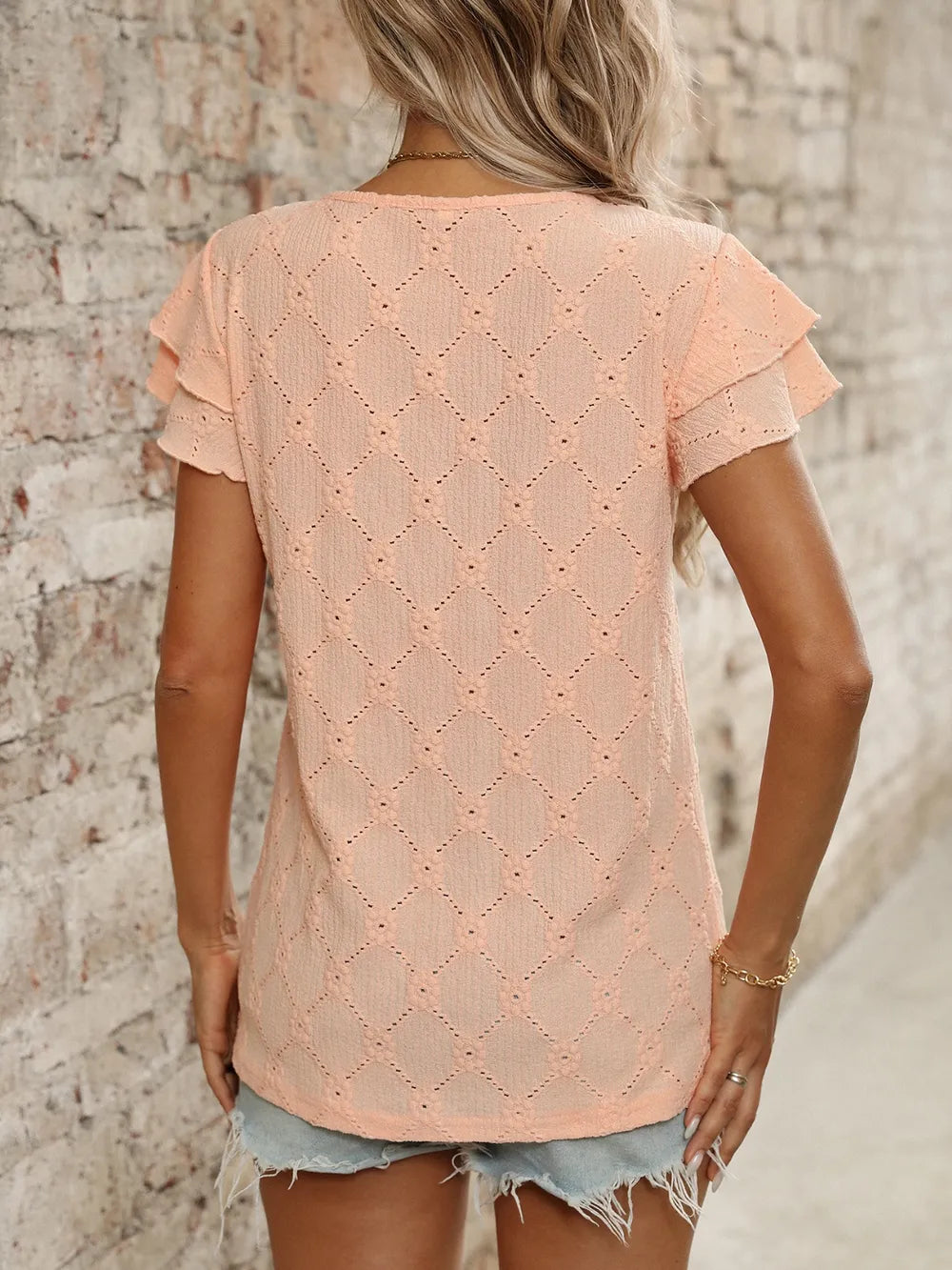 Eyelet Round Neck Double Layered Ruffled Short Sleeve Top