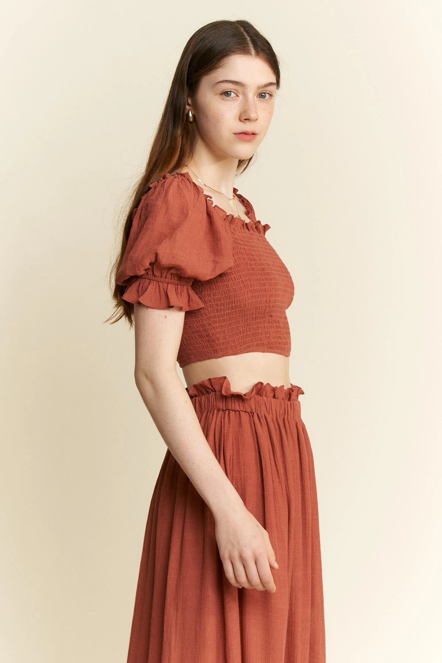 This enchanting maxi dress combines vintage charm with modern comfort. Crafted from a soft cotton-blend fabric, it features a flattering square neckline adorned with delicate ruffles and statement puff sleeves. The rich terracotta color adds warmth to any wardrobe, while the flowing A-line silhouette creates an elegant and timeless look. Perfect for various occasions from casual daytime events to romantic evening outings. The dress's construction allows for comfortable movement while maintaining a sophisticated appearance.